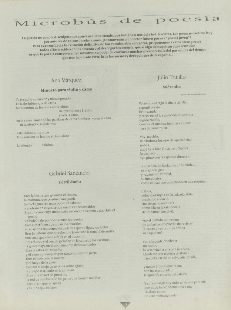 Her writings have been published in national and international newspapers, magazines, journals and anthologies such as “Periódico de Poesía”, under the direction of poet, translator and scholar Pedro Serrano; “La Jornada Semanal”, cultural section of the daily newspaper “La Jornada”, at the time directed by celebrated writer Juan Villoro, and “Región sin Dónde”, anthology edited in Spain by poet, editor and cultural promoter Uberto Stabile.